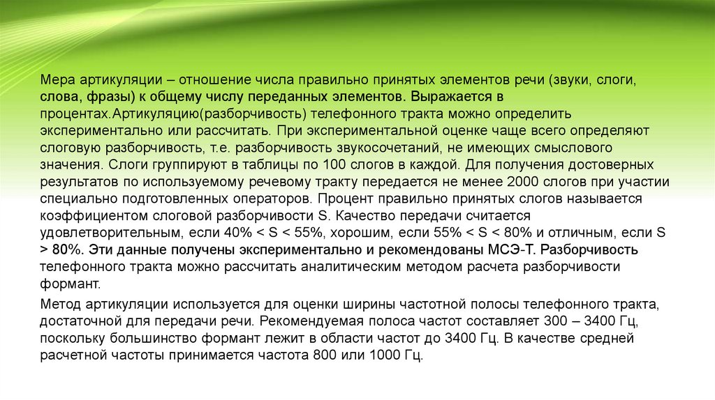 Метод артикуляции используется для оценки ширины частотной полосы телефонного тракта,