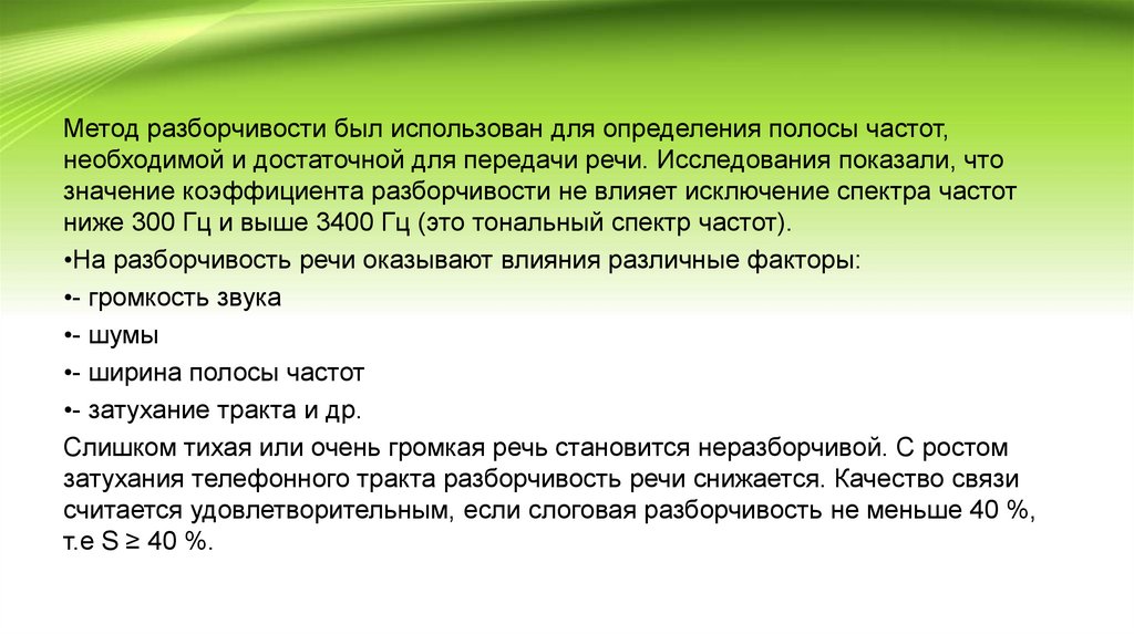 Метод разборчивости был использован для определения полосы частот,необходимой и достаточной для передачи речи. Исследования показали, что