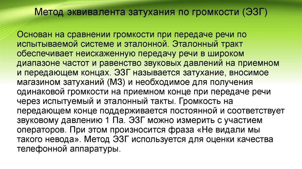 Метод эквивалента затухания по громкости (ЭЗГ)Основан на сравнении громкости при передаче речи по