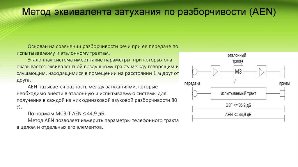 Метод эквивалента затухания по разборчивости (AEN)Основан на сравнении разборчивости речи при ее передаче по