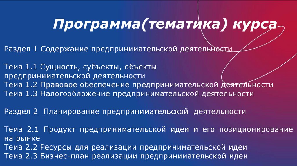 Программа(тематика) курсаРаздел 1 Содержание предпринимательской деятельности