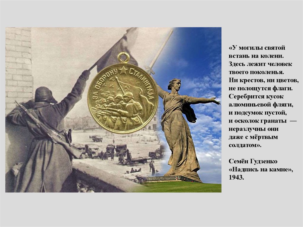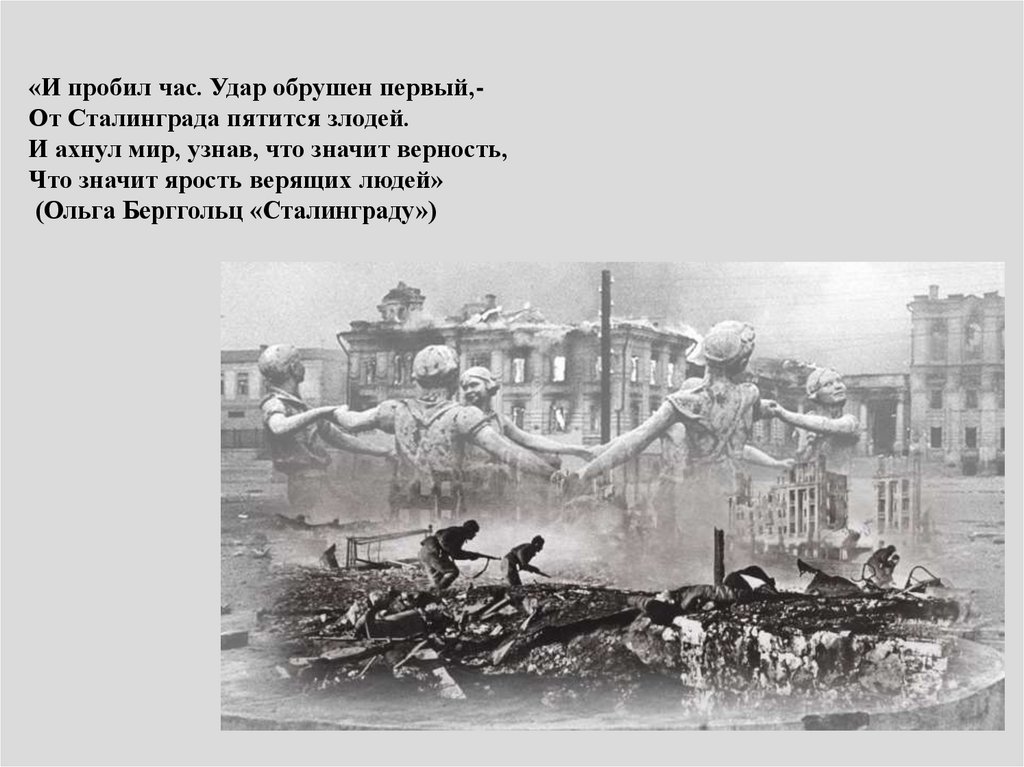 «И пробил час. Удар обрушен первый,От Сталинграда пятится злодей.И ахнул мир, узнав, что значит верность,