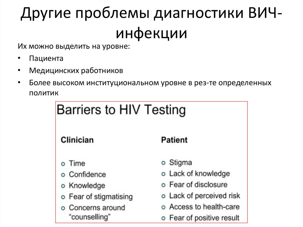 Другие проблемы диагностики ВИЧинфекцииИх можно выделить на уровне: