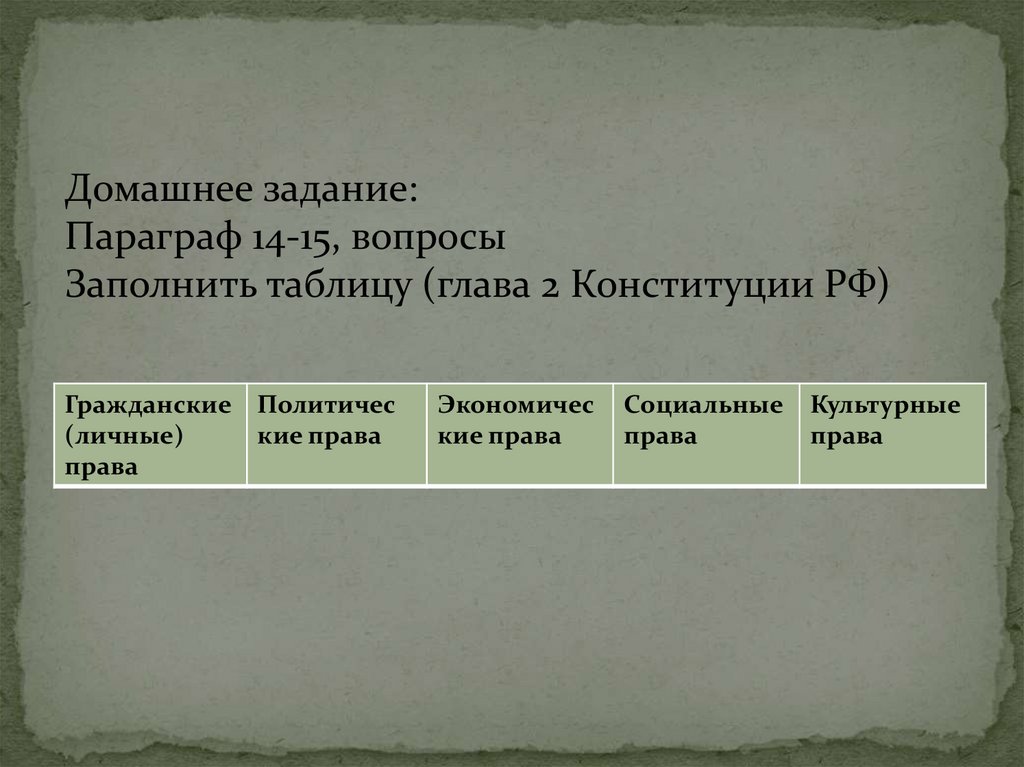 Заполнить таблицу (глава 2 Конституции РФ)