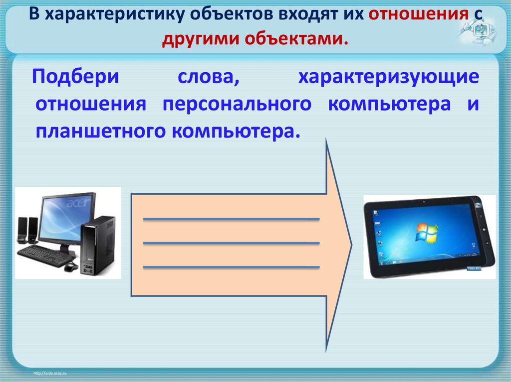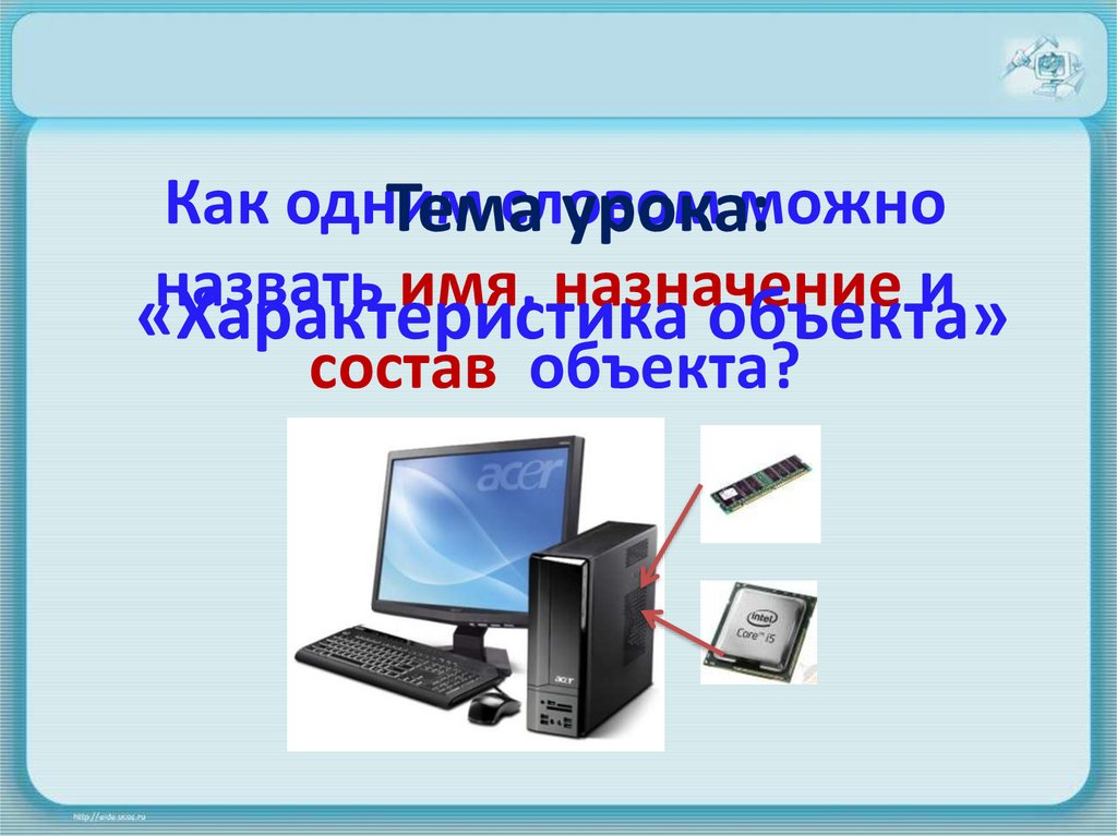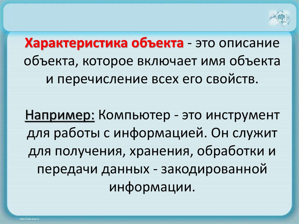 Характеристика объекта - это описаниеобъекта, которое включает имя объекта