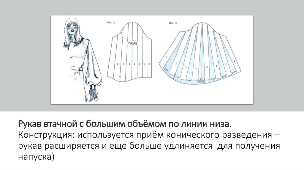 Рукав втачной с большим объёмом по линии низа.Конструкция: используется приём конического разведения –