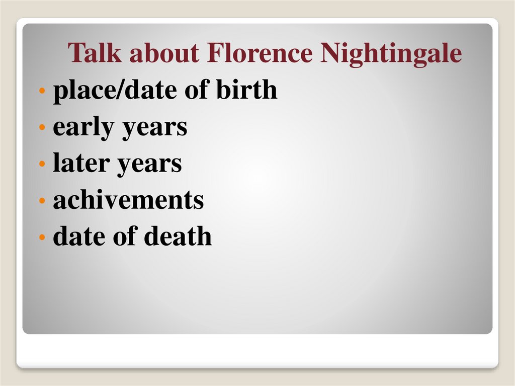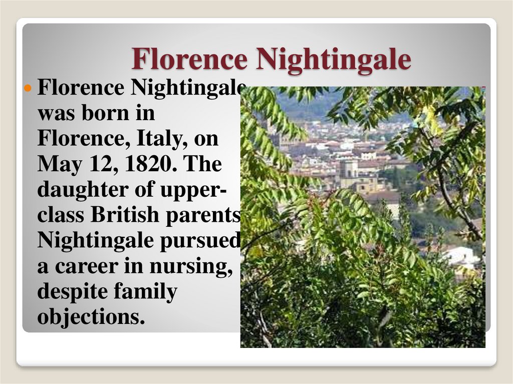 Talk about Florence Nightingale• place/date of birth