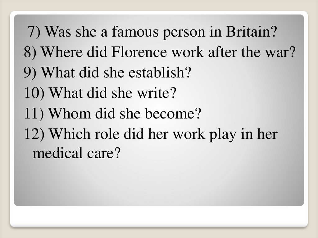 7) Was she a famous person in Britain?8) Where did Florence work after the war?