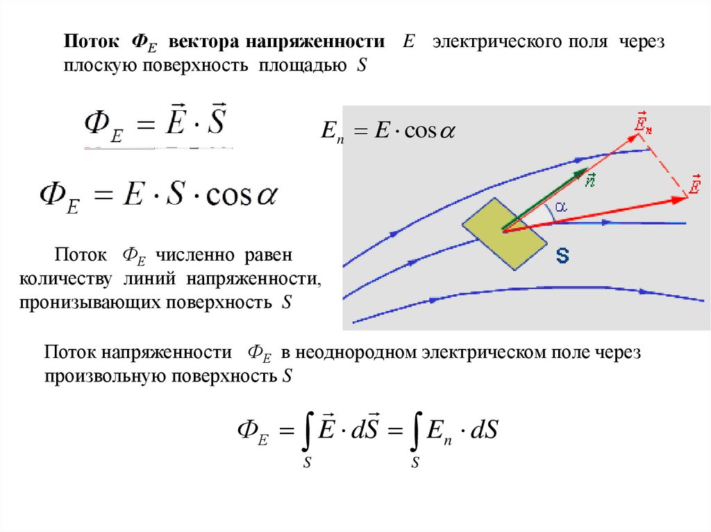 Поток ФЕ вектора напряженности E электрического поля черезплоскую поверхность площадью S