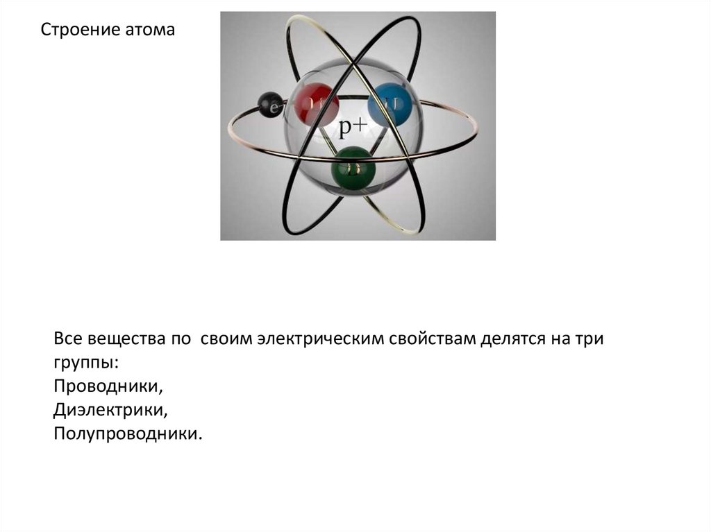 Строение атомаВсе вещества по своим электрическим свойствам делятся на три