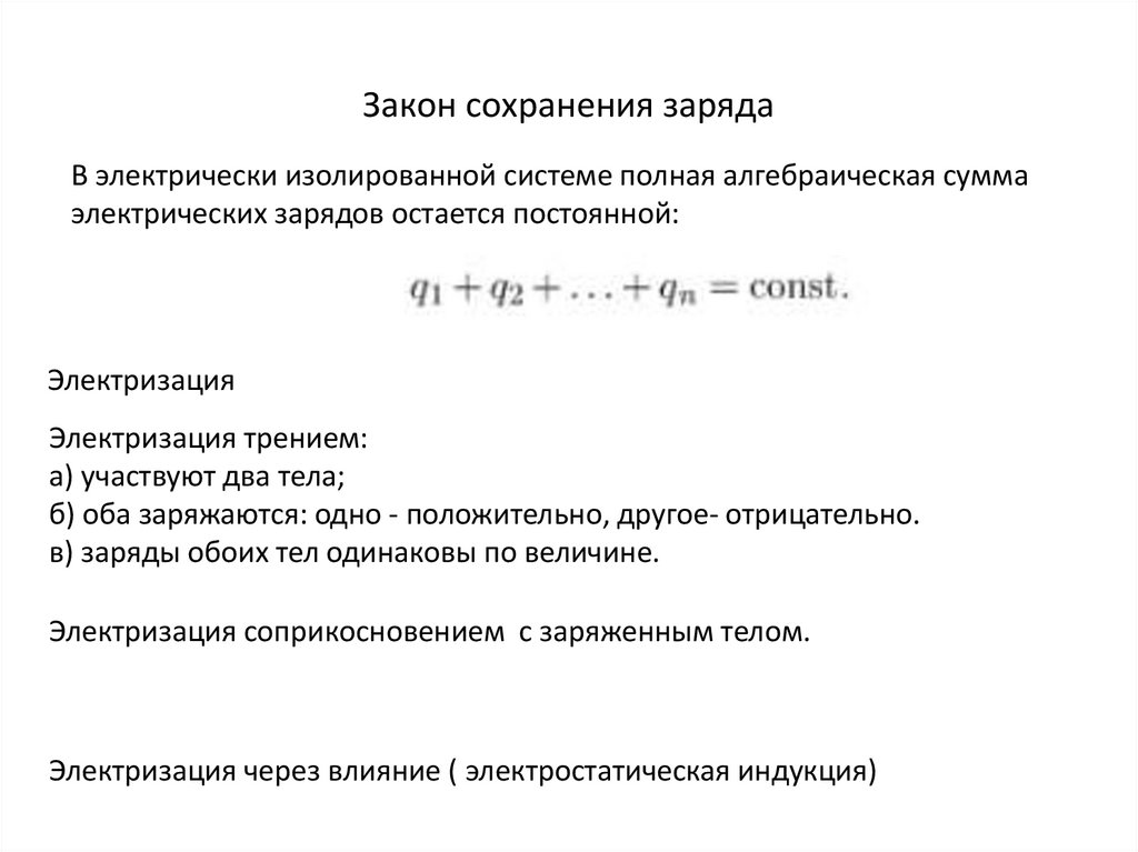 Закон сохранения зарядаВ электрически изолированной системе полная алгебраическая сумма