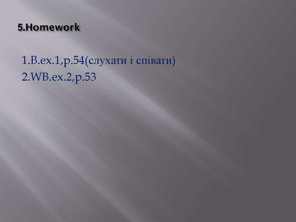 1.B.ex.1,p.54(слухати і співати)2.WB.ex.2,p.53
