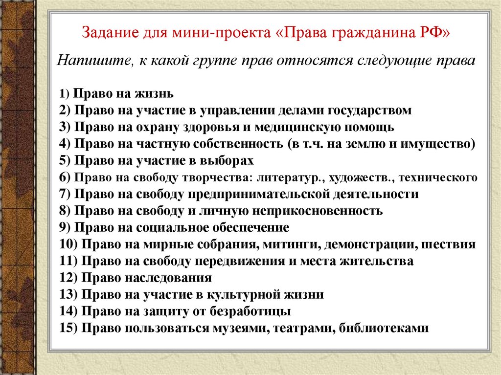 Задание для мини-проекта «Права гражданина РФ»Напишите, к какой группе прав относятся следующие права