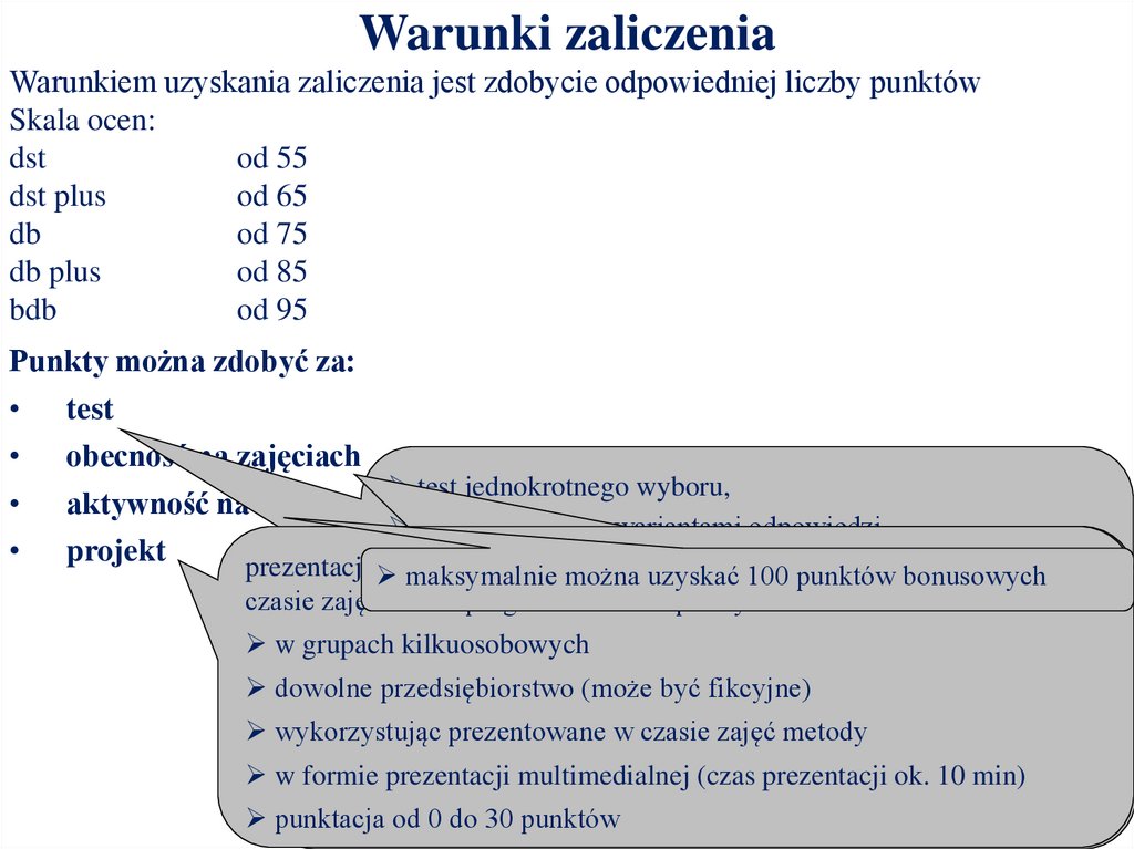 Warunki zaliczeniaWarunkiem uzyskania zaliczenia jest zdobycie odpowiedniej liczby punktów