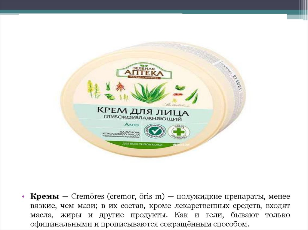 • Кремы — Cremōres (cremor, ōris m) — полужидкие препараты, менеевязкие, чем мази; в их состав, кроме лекарственных средств, входят