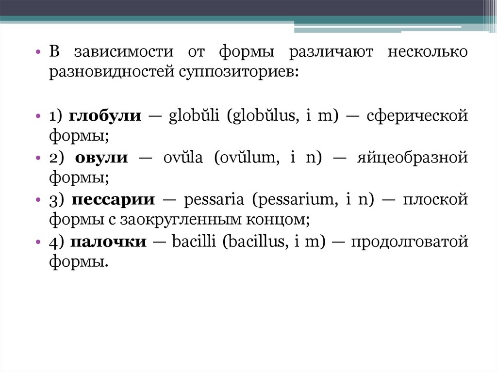 • В зависимости от формы различают несколькоразновидностей суппозиториев: