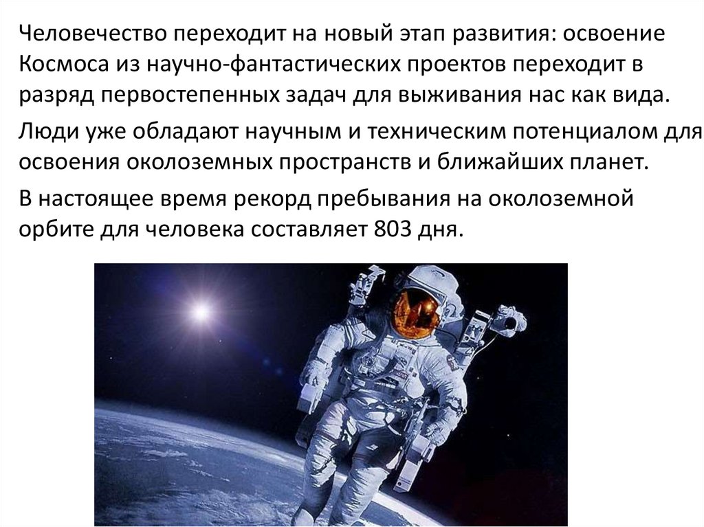 • Человечество переходит на новый этап развития: освоениеКосмоса из научно-фантастических проектов переходит в