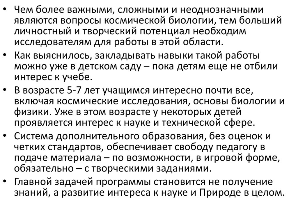 • Чем более важными, сложными и неоднозначнымиявляются вопросы космической биологии, тем больший
