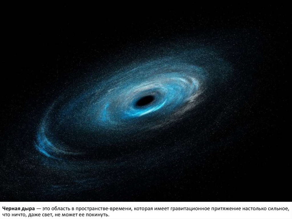 Черная дыра — это область в пространстве-времени, которая имеет гравитационное притяжение настолько сильное,что ничто, даже свет, не может ее покинуть.