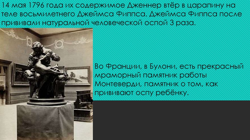14 мая 1796 года их содержимое Дженнер втёр в царапину нателе восьмилетнего Джеймса Фиппса. Джеймса Фиппса после