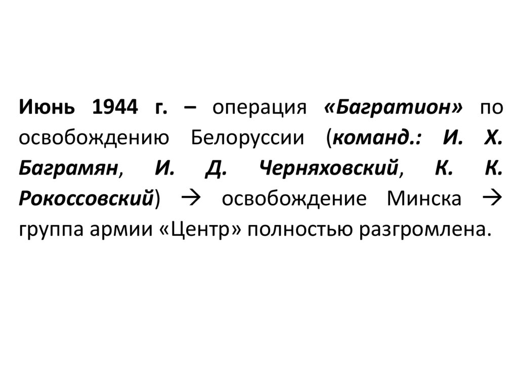 Июнь 1944 г. – операция «Багратион» поосвобождению Белоруссии (команд.: И. Х.