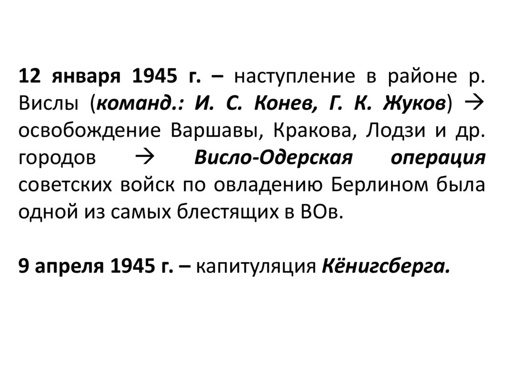 12 января 1945 г. – наступление в районе р.Вислы (команд.: И. С. Конев, Г. К. Жуков)