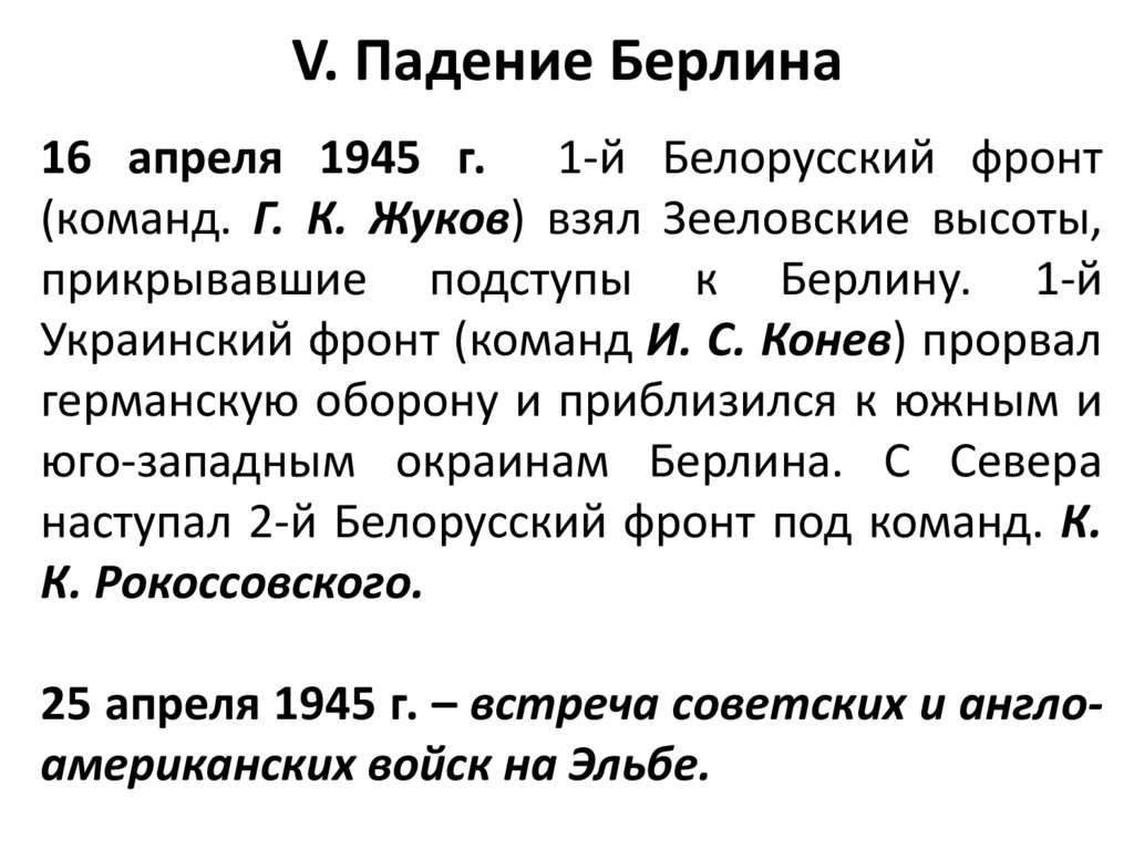 V. Падение Берлина16 апреля 1945 г. 1-й Белорусский фронт