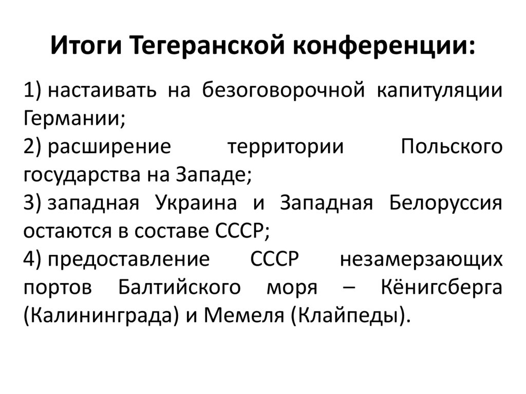 Итоги Тегеранской конференции:1) настаивать на безоговорочной капитуляции