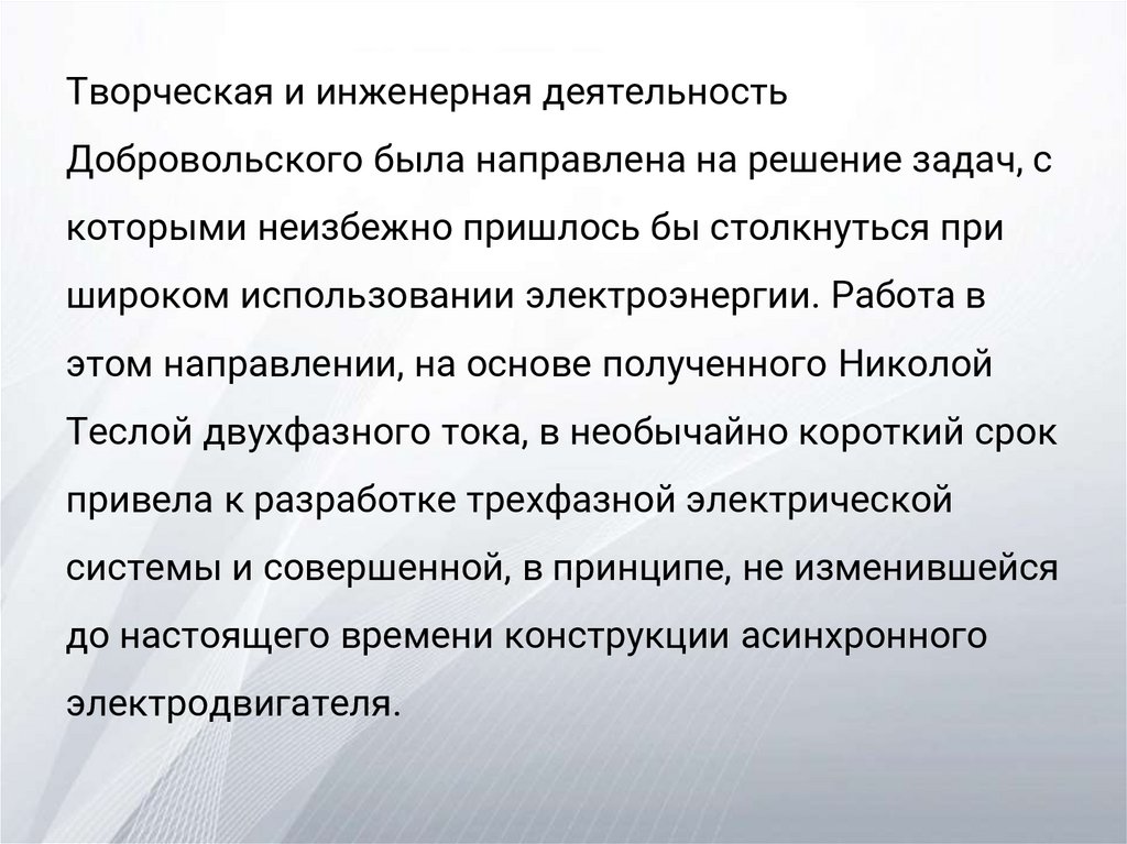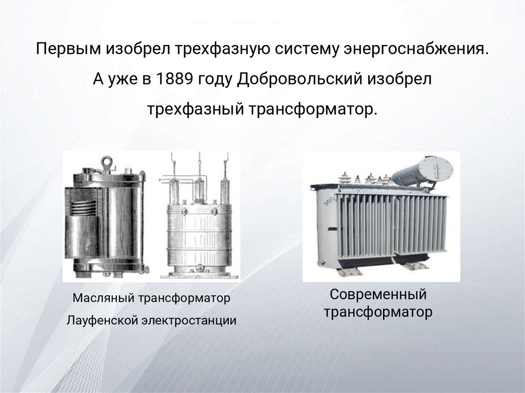 Первым изобрел трехфазную систему энергоснабжения.А уже в 1889 году Добровольский изобрел