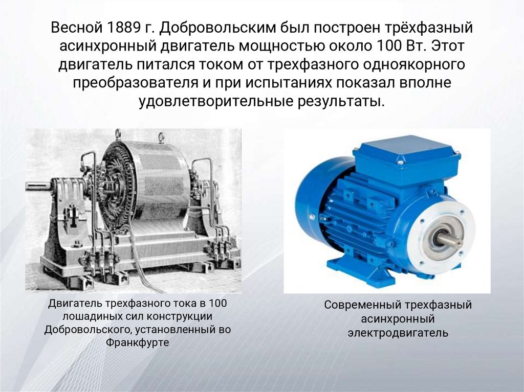 Весной 1889 г. Добровольским был построен трёхфазныйасинхронный двигатель мощностью около 100 Вт. Этот