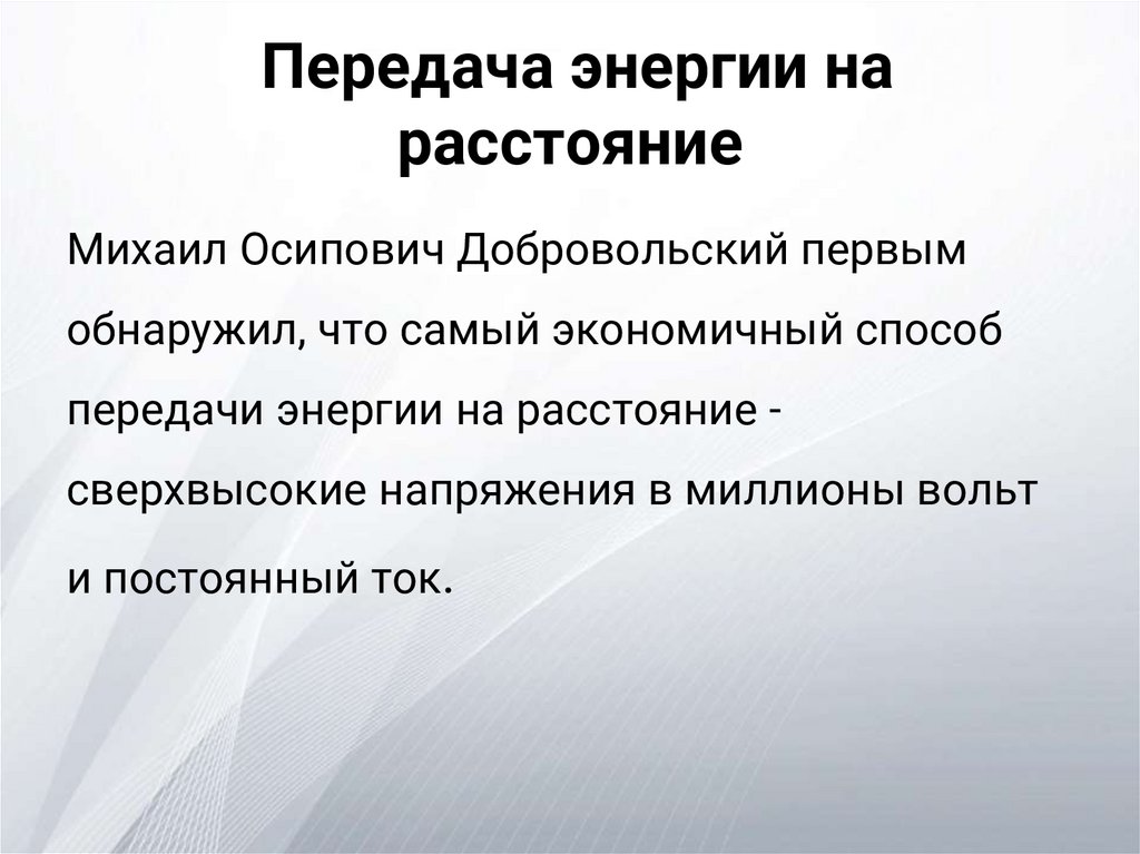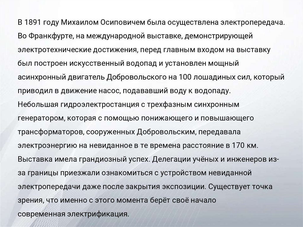 В 1891 году Михаилом Осиповичем была осуществлена электропередача.Во Франкфурте, на международной выставке, демонстрирующей