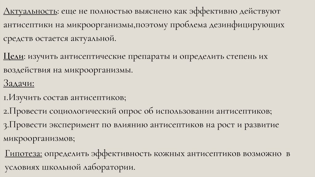 Актуальность: еще не полностью выяснено как эффективно действуютантисептики на микроорганизмы,поэтому проблема дезинфицирующих