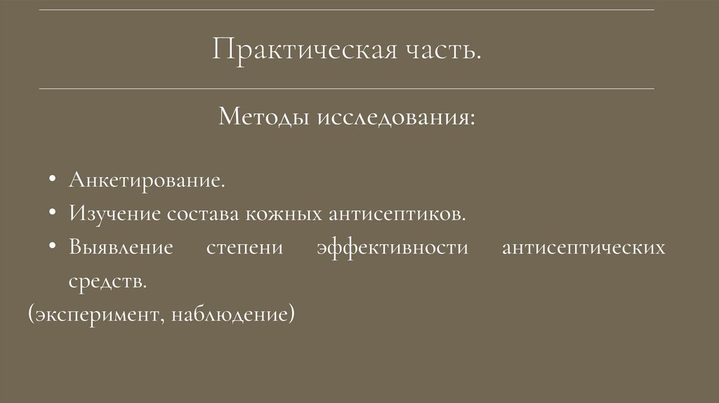 • Изучение состава кожных антисептиков.