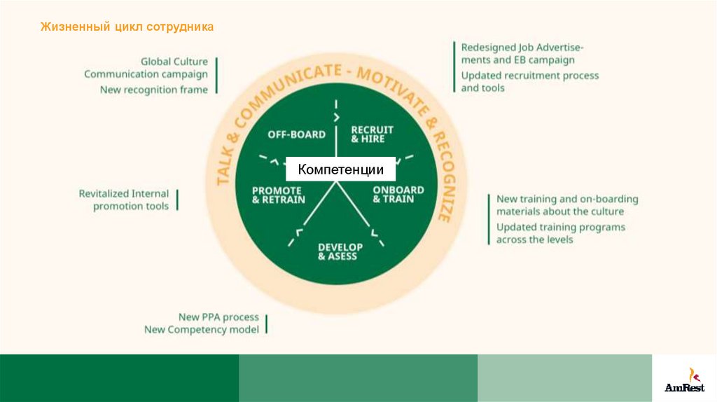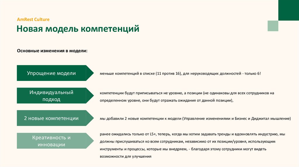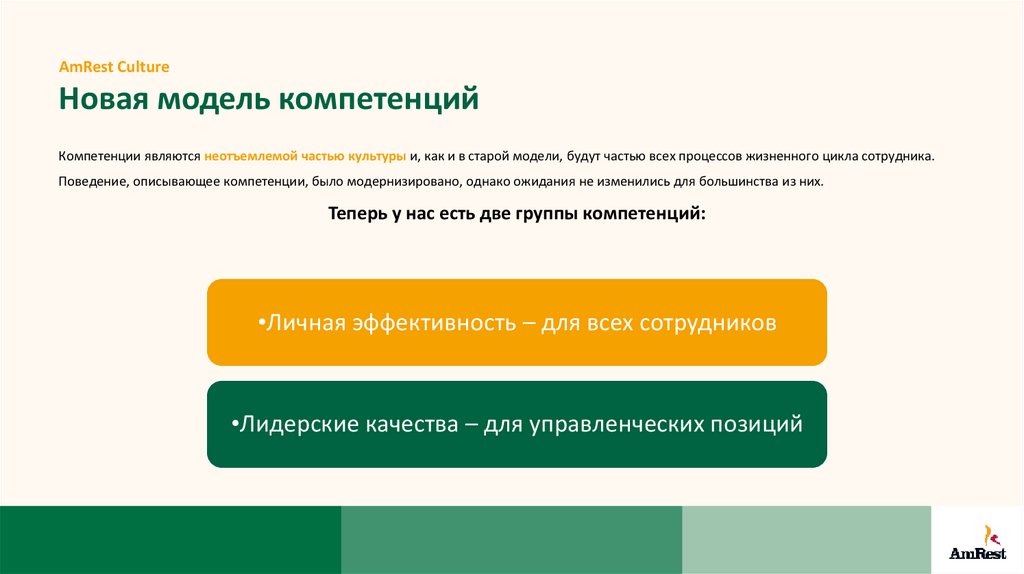 Компетенции являются неотъемлемой частью культуры и, как и в старой модели, будут частью всех процессов жизненного цикла сотрудника.