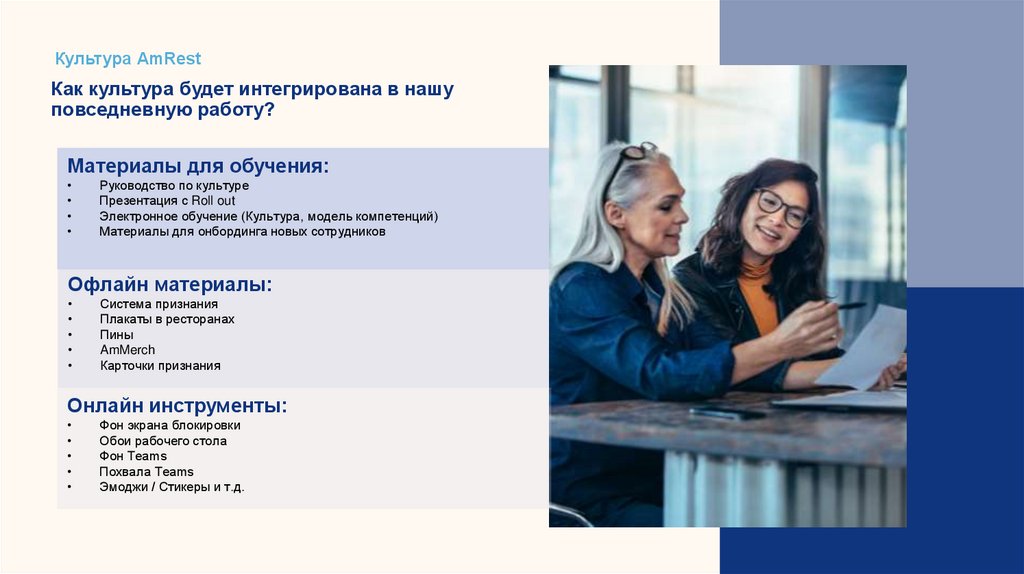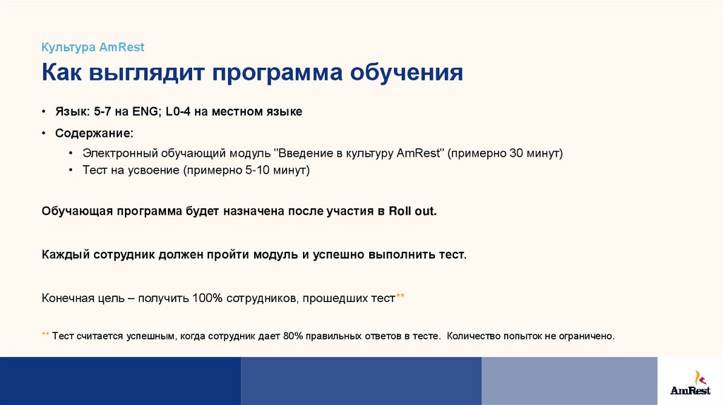 • Электронный обучающий модуль "Введение в культуру AmRest" (примерно 30 минут)