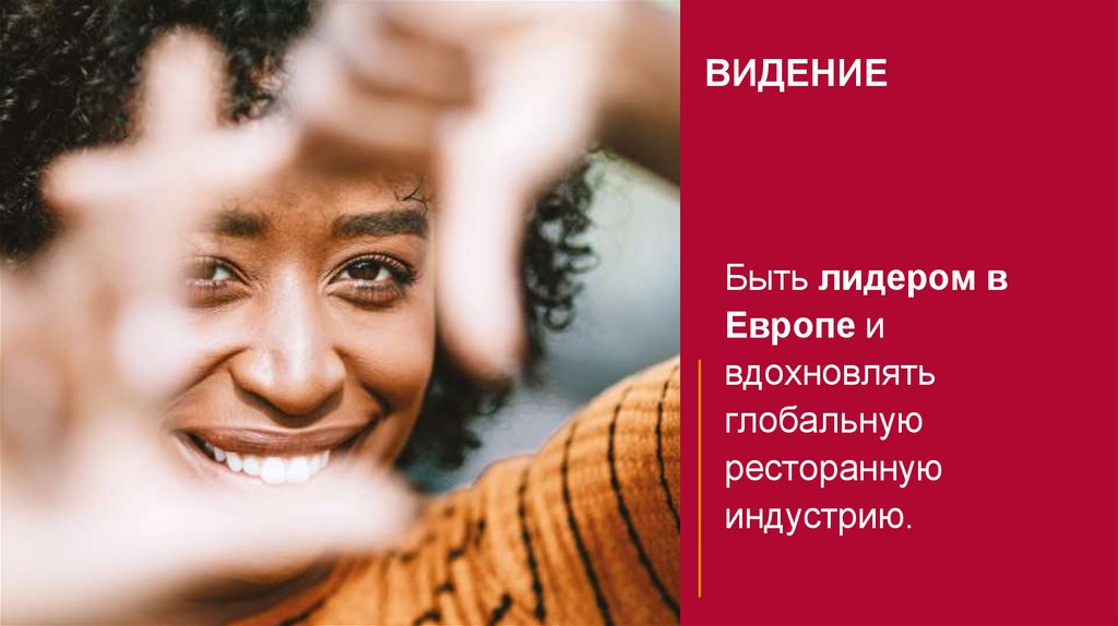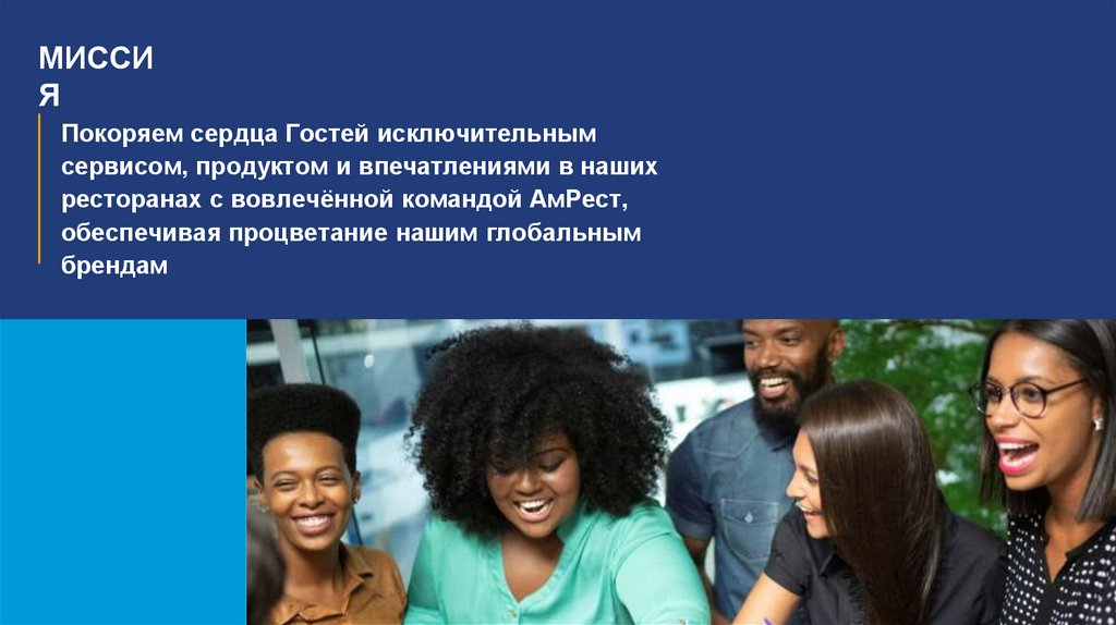 Мы хотим быть достойной доверия, ориентированной на клиентов компанией, созданной увлеченными сотрудниками AmRest. Мы верим, что только