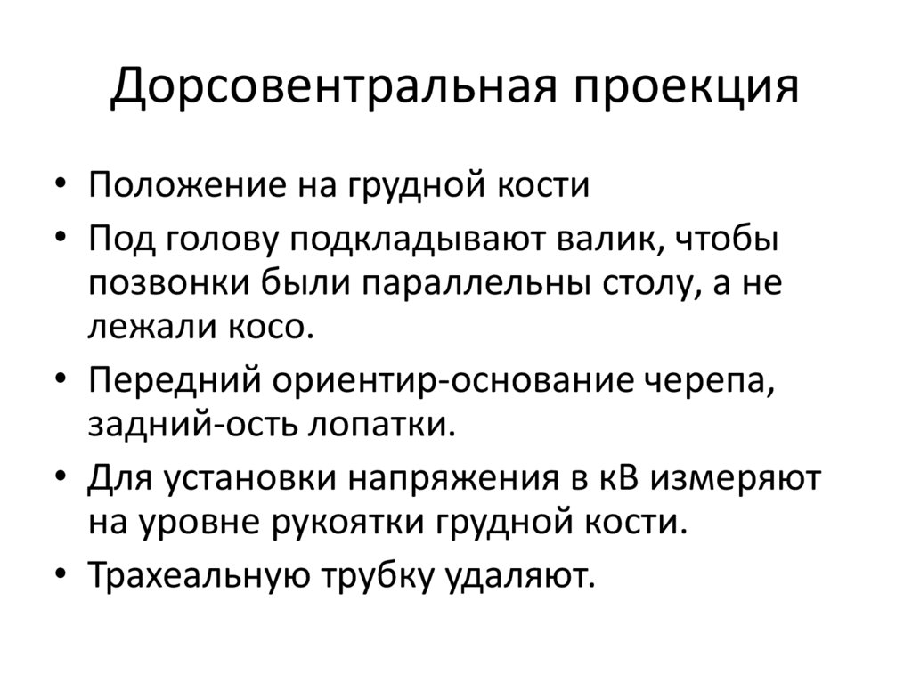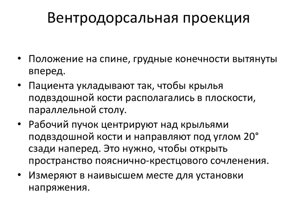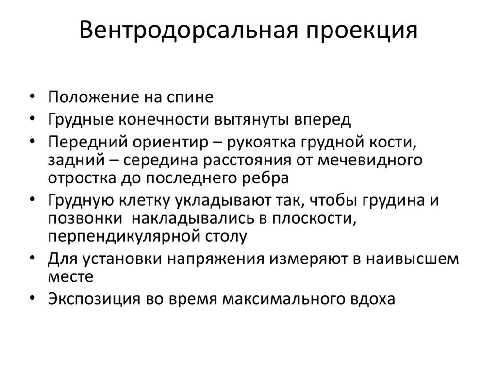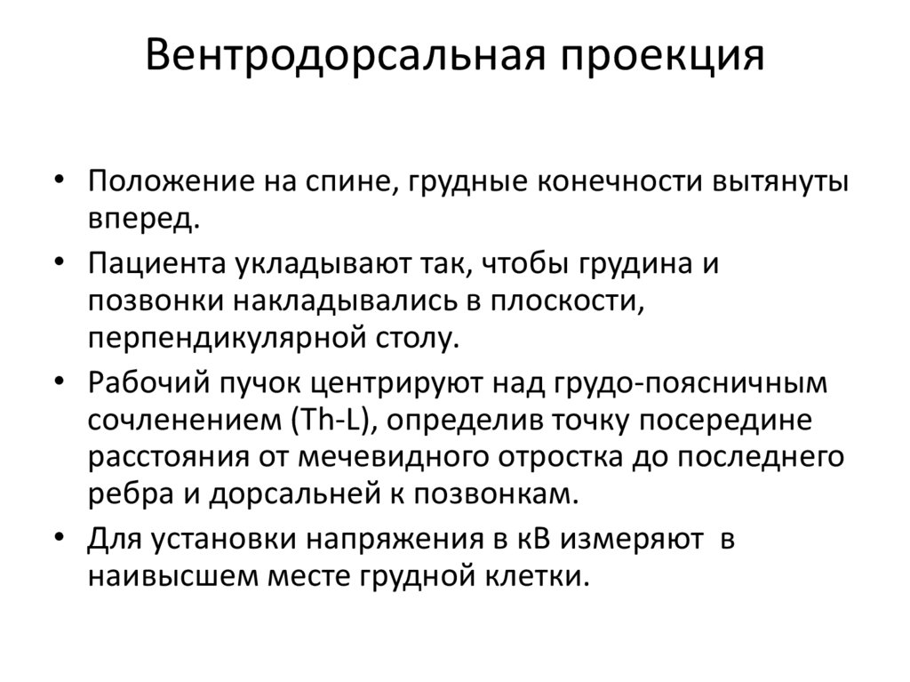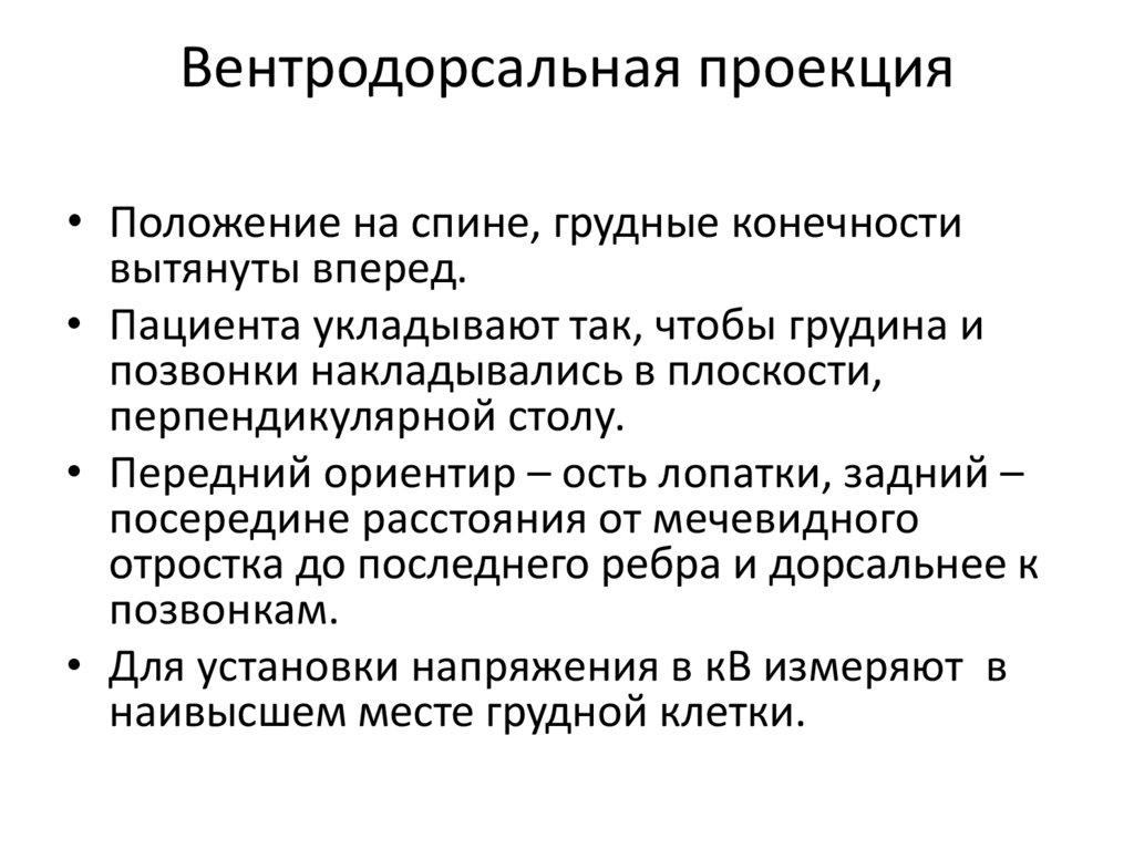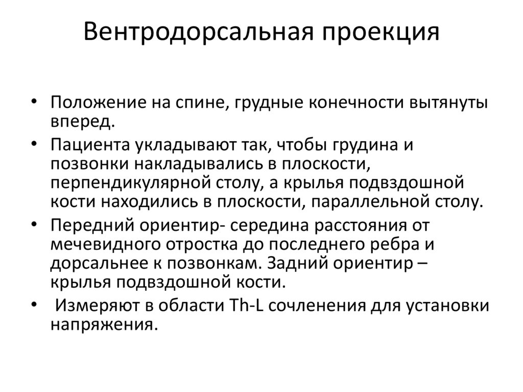Вентродорсальная проекция• Пациента укладывают в положении на спине, с