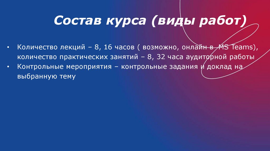 Состав курса (виды работ)Количество лекций – 8, 16 часов ( возможно, онлайн в MS Teams),
