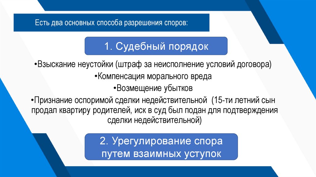 Есть два основных способа разрешения споров:1. Судебный порядок