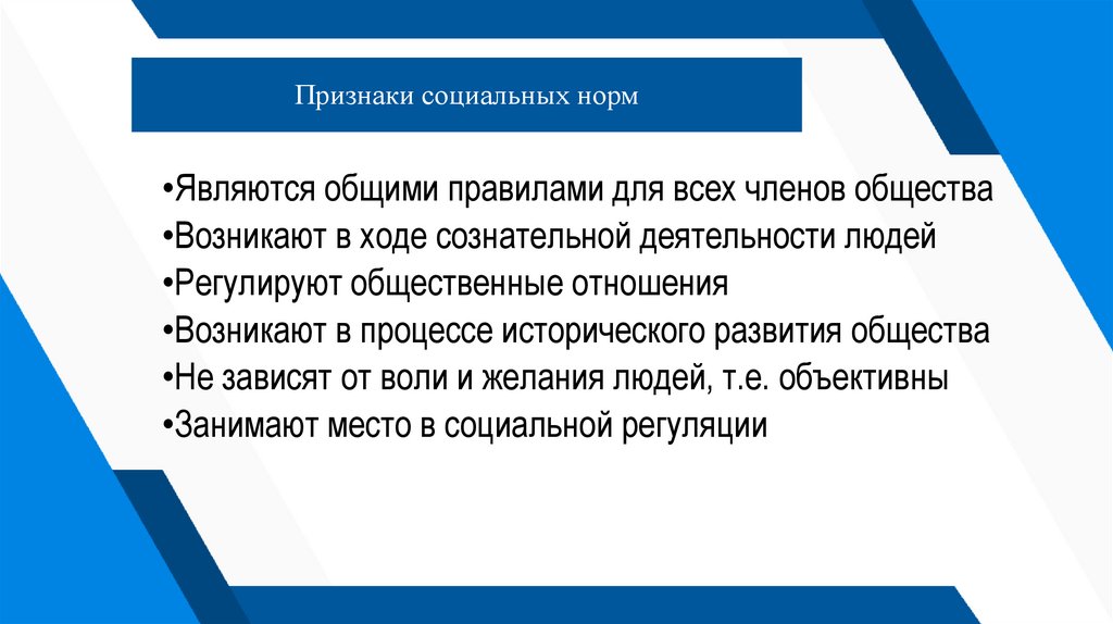 Признаки социальных норм•Являются общими правилами для всех членов общества
