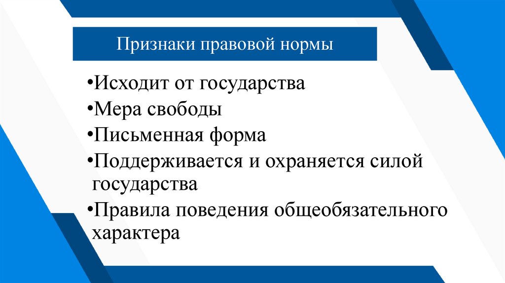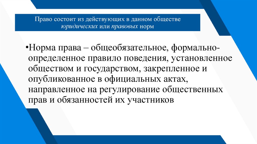•Норма права – общеобязательное, формальноопределенное правило поведения, установленное