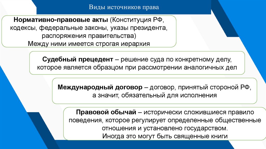 Виды источников праваНормативно-правовые акты (Конституция РФ,
