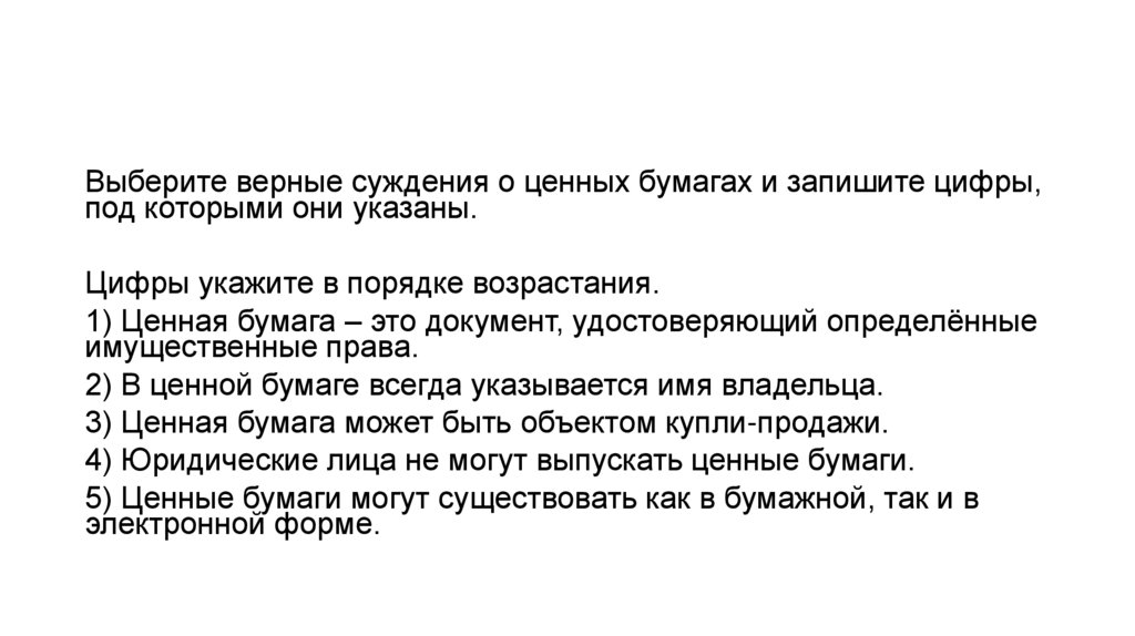 Выберите верные суждения о ценных бумагах и запишите цифры,под которыми они указаны.