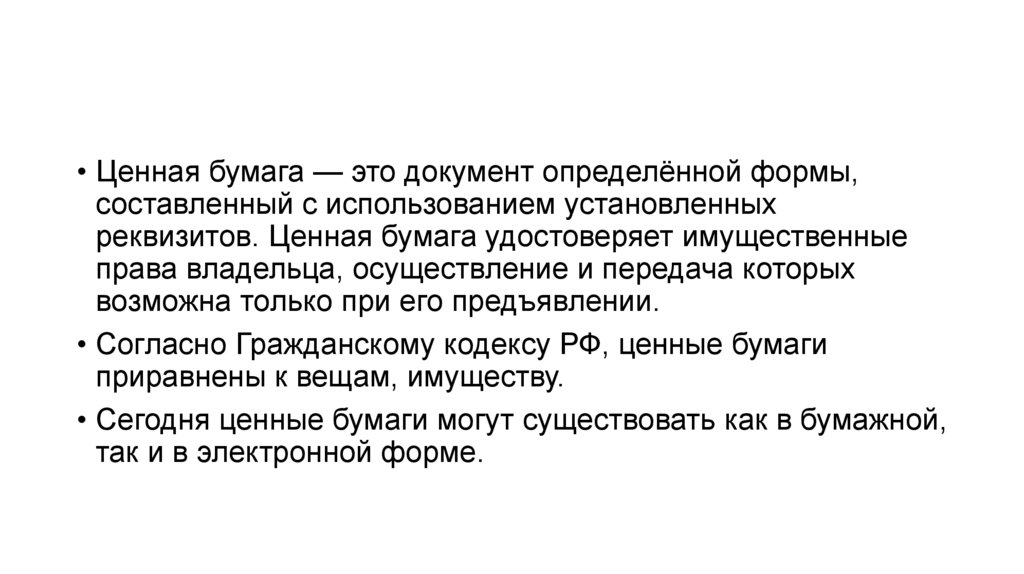 • Ценная бумага — это документ определённой формы,составленный с использованием установленных