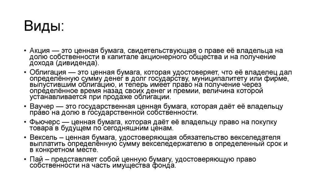 Виды:• Акция — это ценная бумага, свидетельствующая о праве её владельца на