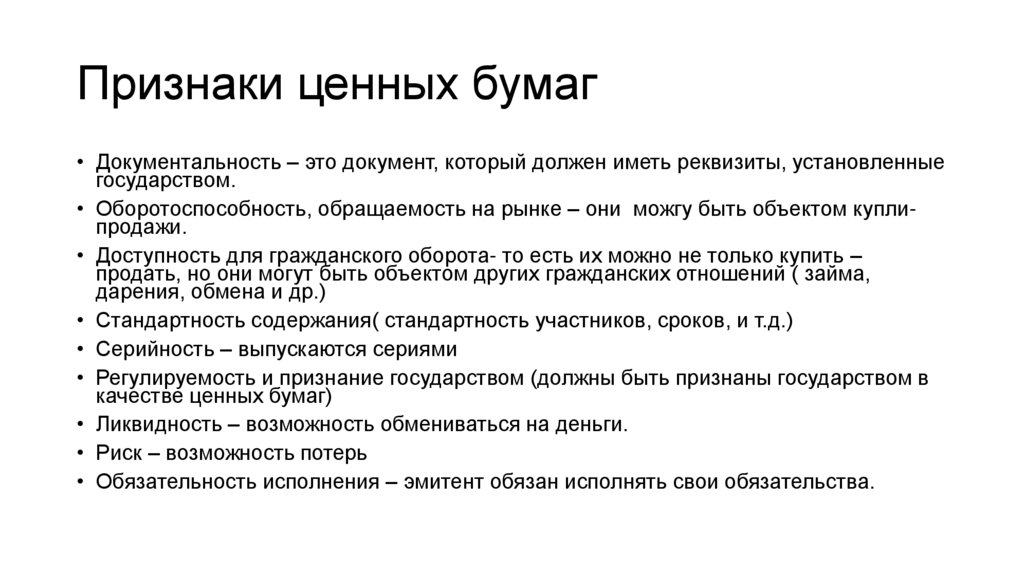 Признаки ценных бумаг• Документальность – это документ, который должен иметь реквизиты, установленные