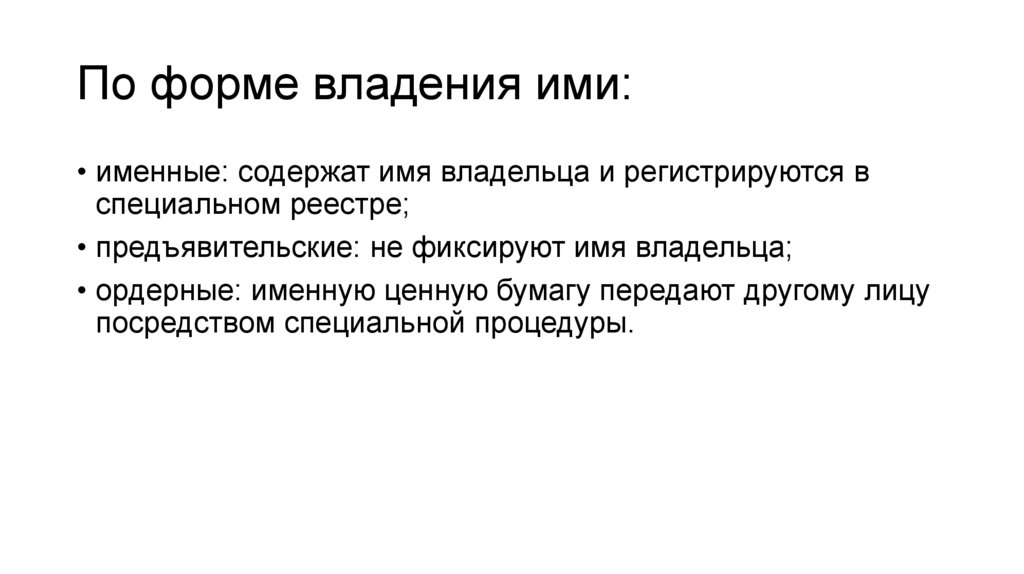 По форме владения ими:• именные: содержат имя владельца и регистрируются в