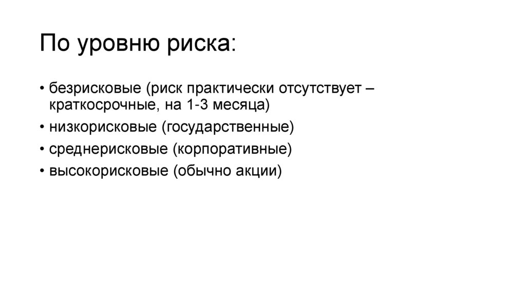 По уровню риска:• безрисковые (риск практически отсутствует –