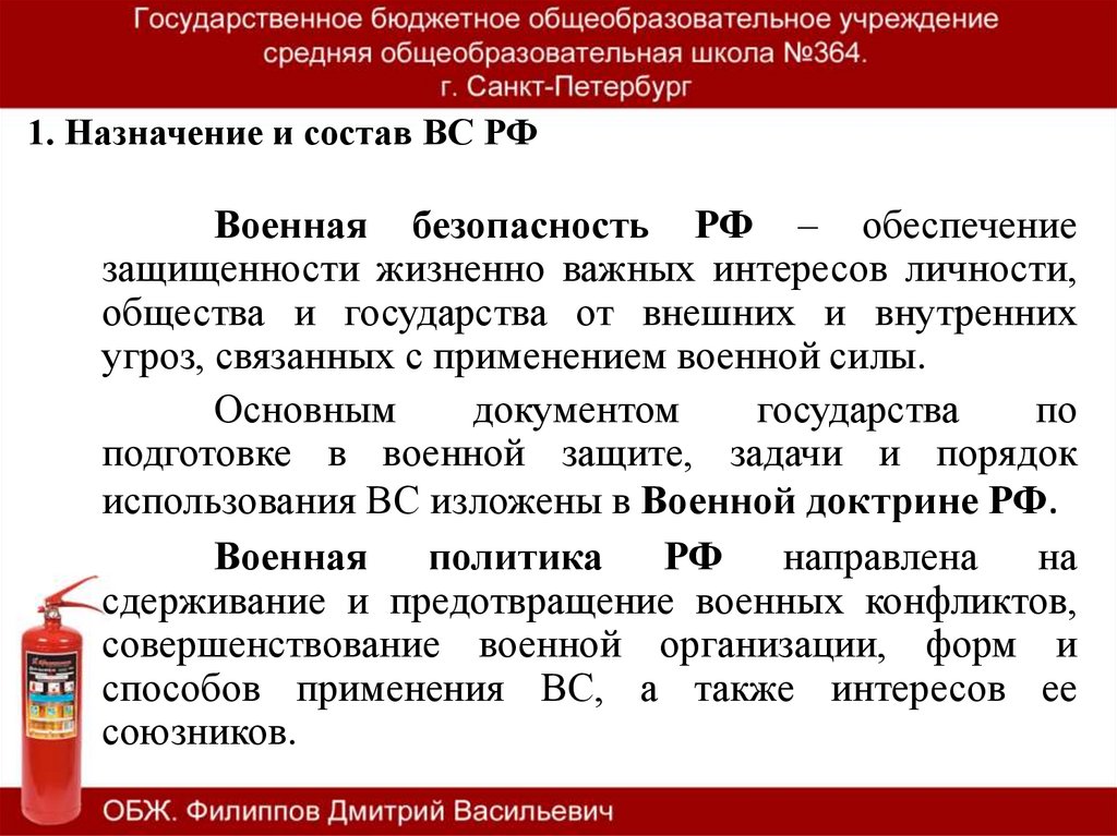 1. Назначение и состав ВС РФВоенная безопасность РФ – обеспечение