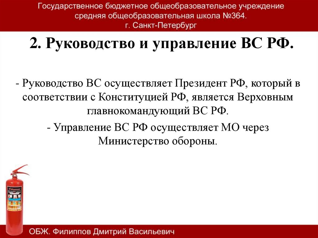 2. Руководство и управление ВС РФ.- Руководство ВС осуществляет Президент РФ, который в